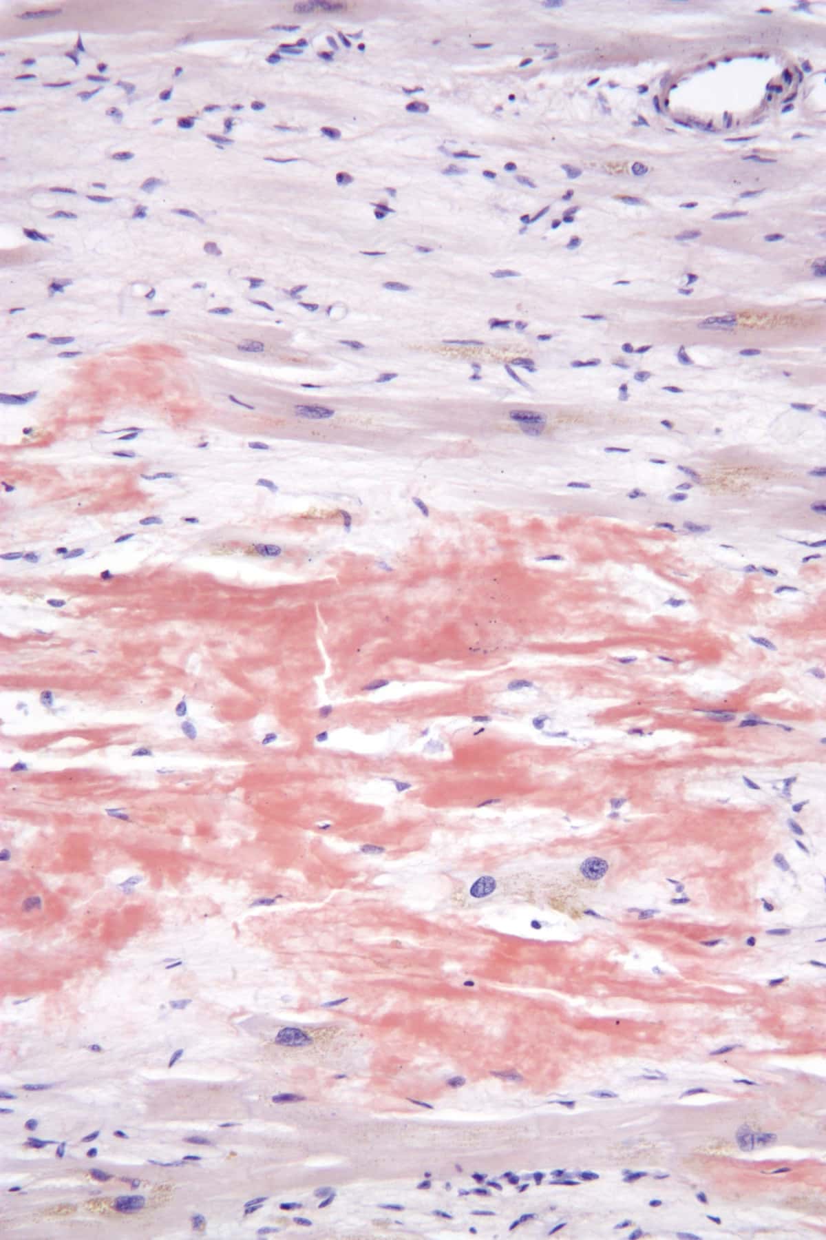 Le diagnostic d’amylose AL est histologique: dépôts amyloïdes colorés par le Rouge Congo avec une biréfringence jaune verte caractéristique en lumière polarisée.