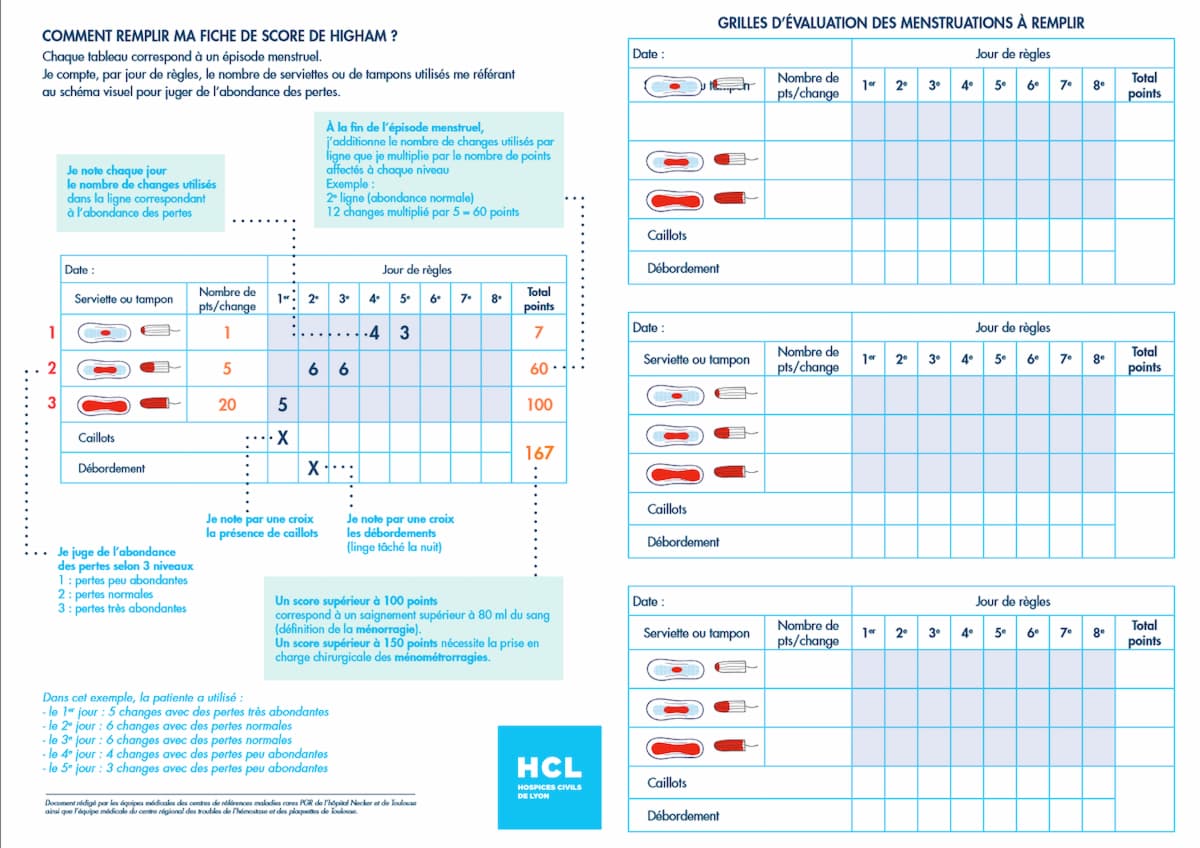 - Hémorragies génitales hautes survenant pendant les règles (femmes en âge de procréer et non enceintes) d’un volume supérieur à 80 mL ou d’une durée supérieure à 6 jours.