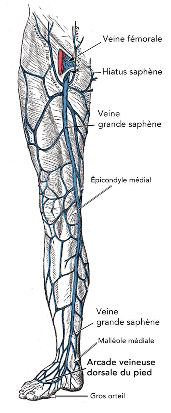 Localisations fréquentes: jonctions saphéno-fémorales (JSF) et saphéno-poplitée (JSP). - Cordon induré, douloureux, inflammatoire d’une veine superficielle
